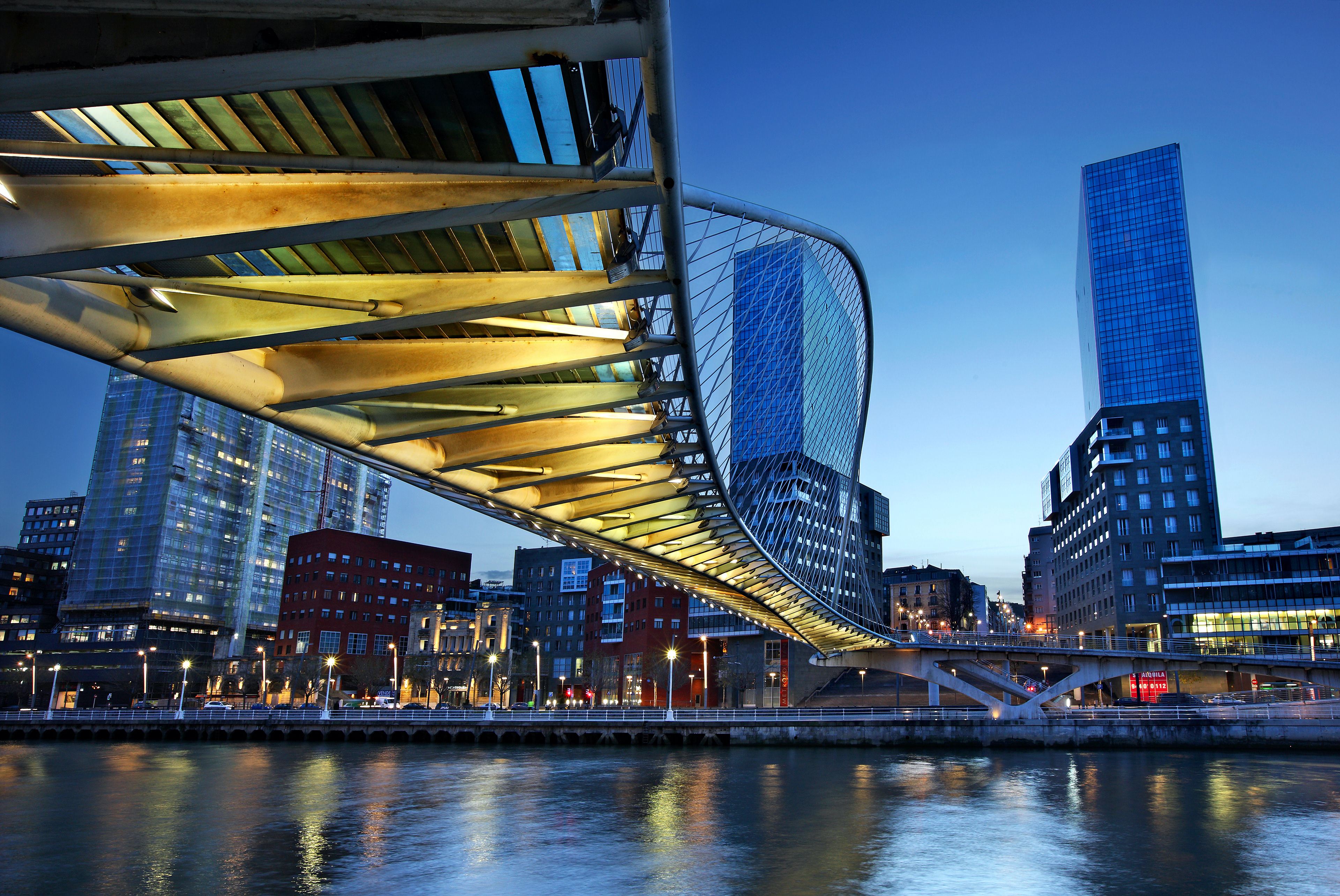 Voor de autoriteiten van Bilbao, bezig om het industriële malheur van hun stad om te buigen naar een moderne, aantrekkelijke dienstenstad, was Calatrava een welkome architect om een deeltje van dat ‘nieuwe’ Bilbao aan te leveren. In dit geval gaat het om de voetgangersbrug over de rivier de Nervión; een handige oversteek tussen het nieuwe centrum (Ensanche) en de volksbuurt Castanos. Het resultaat was de Zubizuri > (Baskisch voor ‘witte brug’), een overspanning die een feestje is om naar te kijken... en een soms eng avontuur om overheen te lopen.
